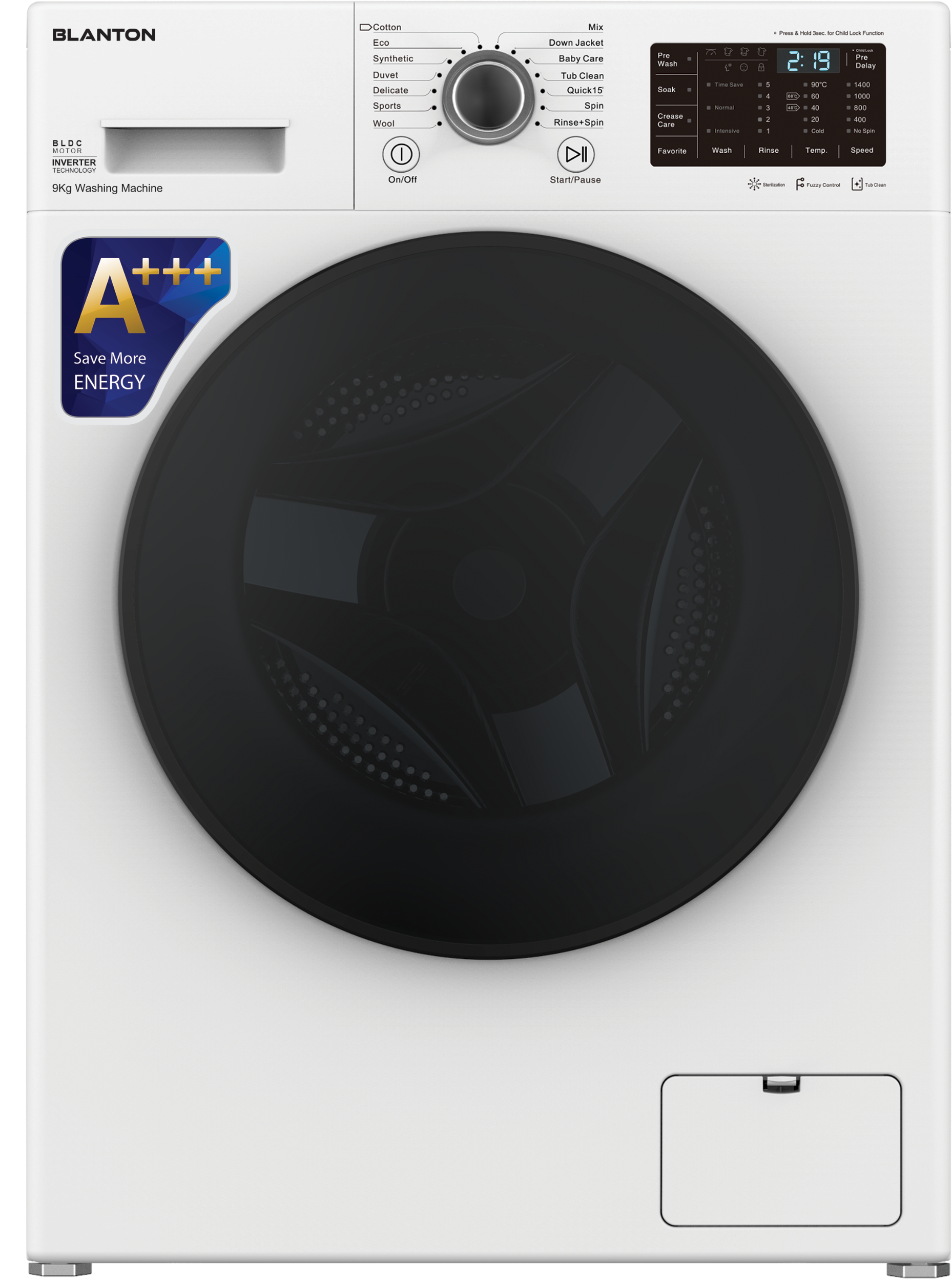 ماشین لباسشویی 9 کیلویی 1400 دور، دارای درب بزرگ دوجداره 180 درجه ،با برد لمسی، اینورتر BLDC ، 14برنامه شستشو و 2 برنامه ویژه، مصرف انرژی +++A